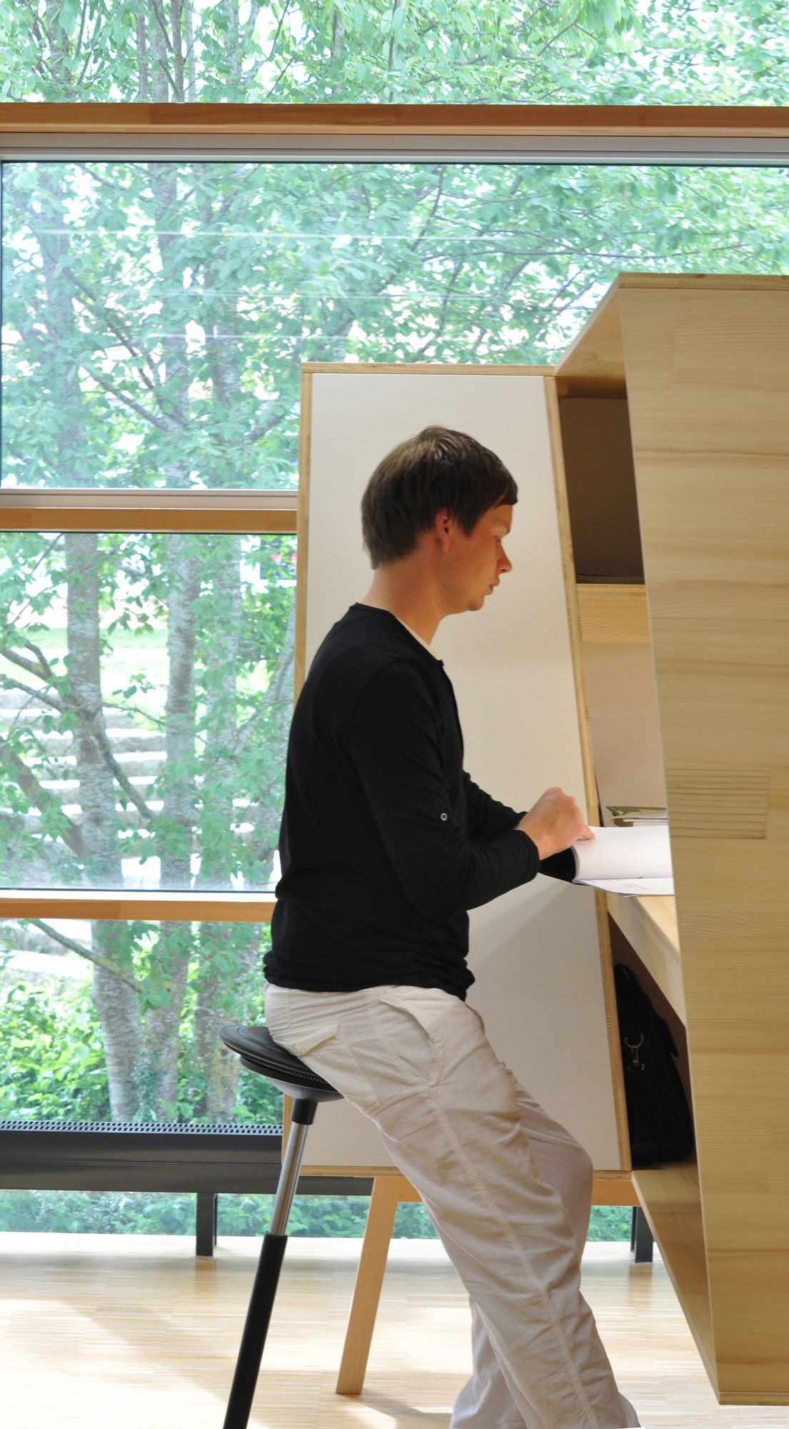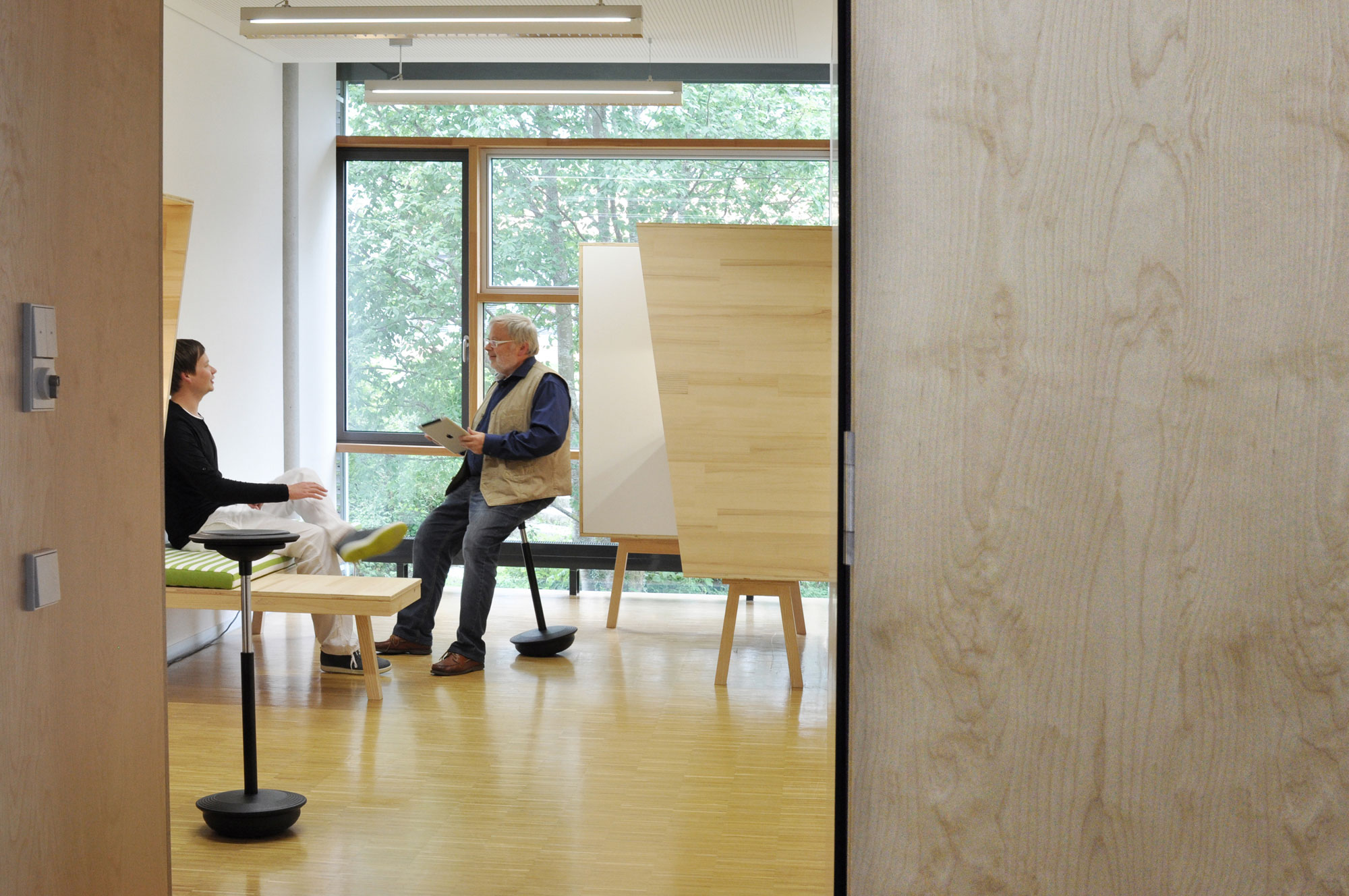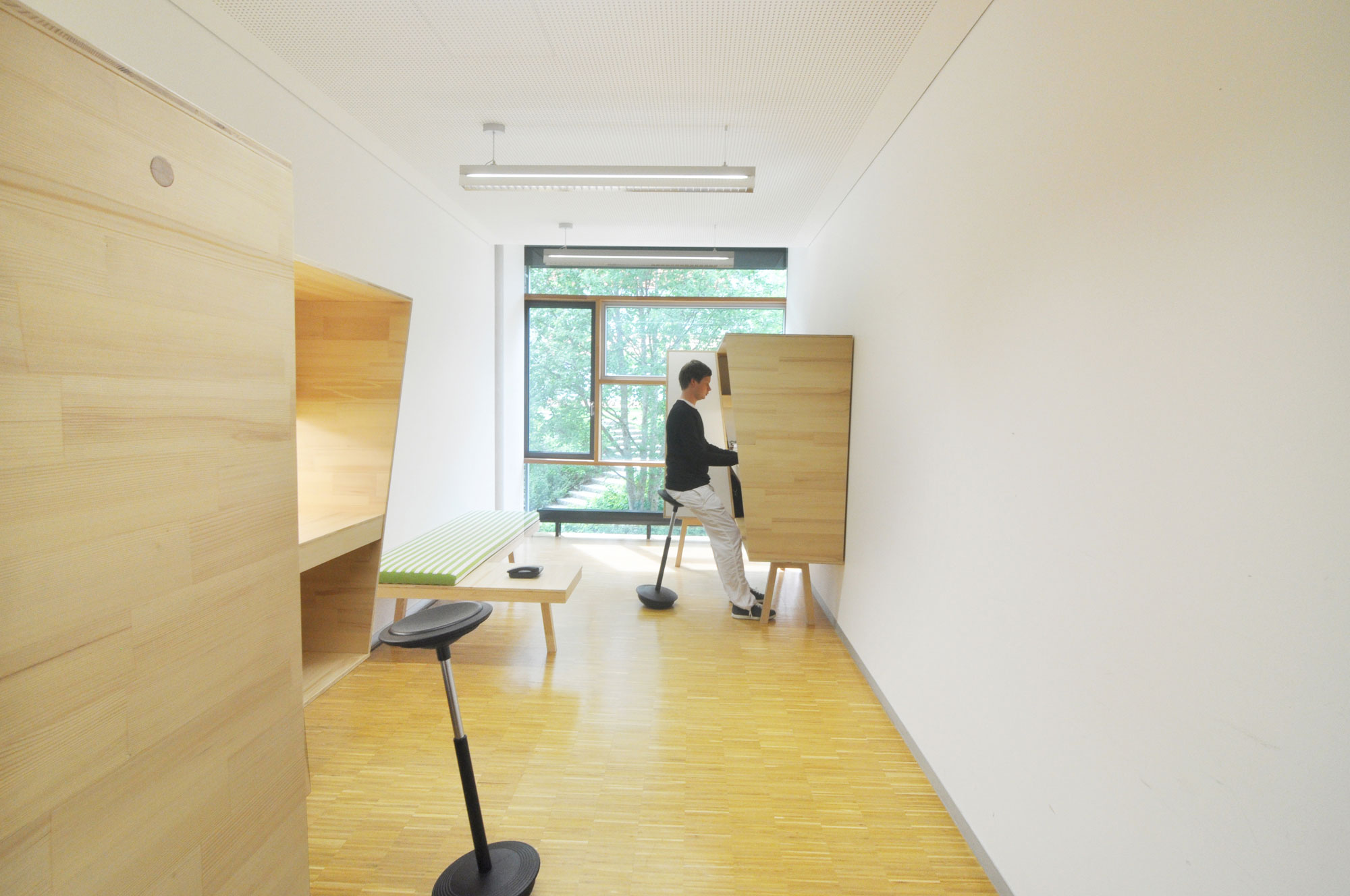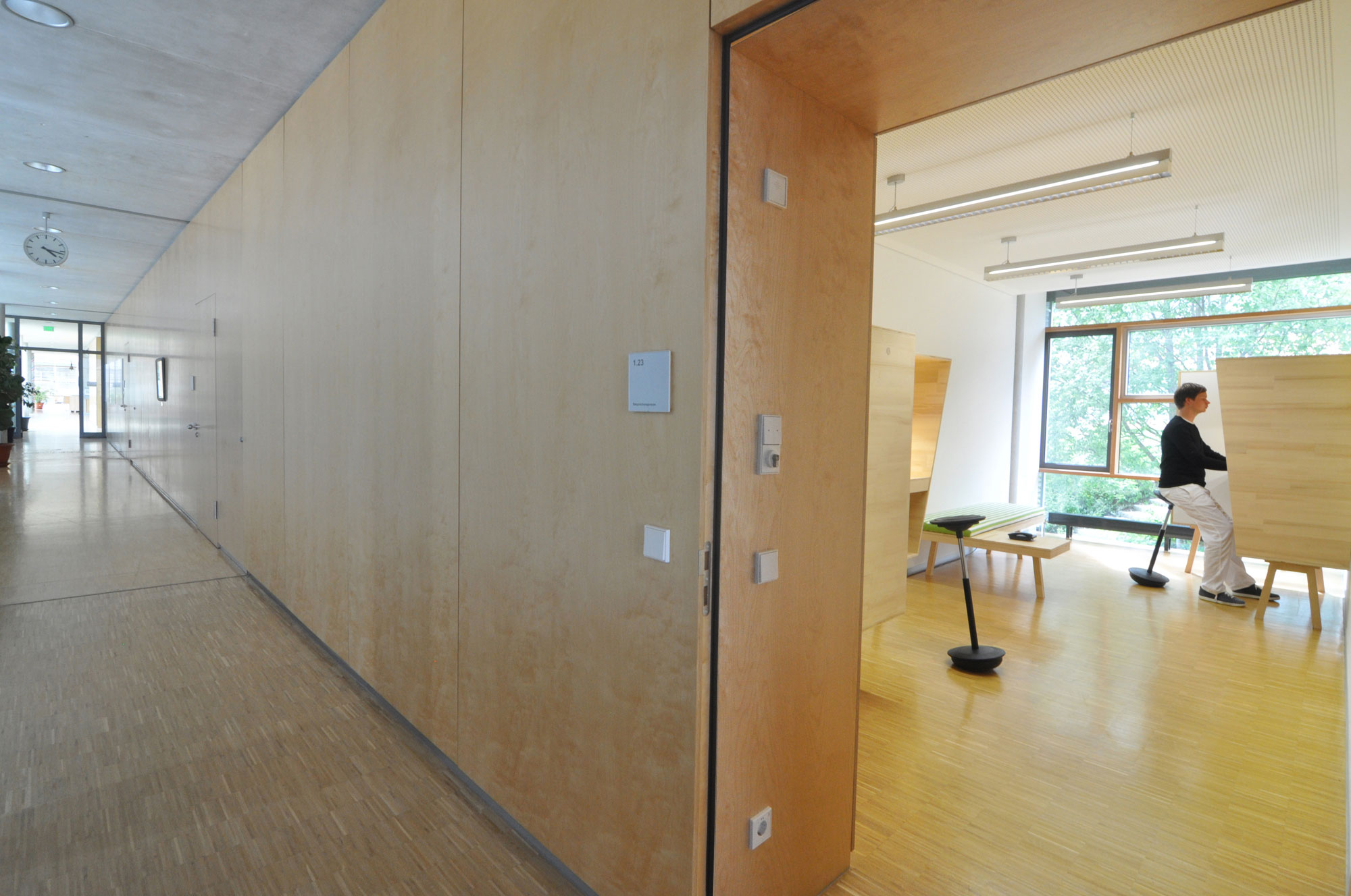 Dies wurde durch zwei L-förmige Schreibräume und einer L-förmigen Ruhebank ermöglicht. Sollten innerhalb des Schulgebäudes Umstrukturierungen stattfinden, lassen sich alle Ausbauteile aufgrund der modularen Systembauweise mühelos in andere Räumlichkeiten umziehen, erweitern oder vereinzeln.