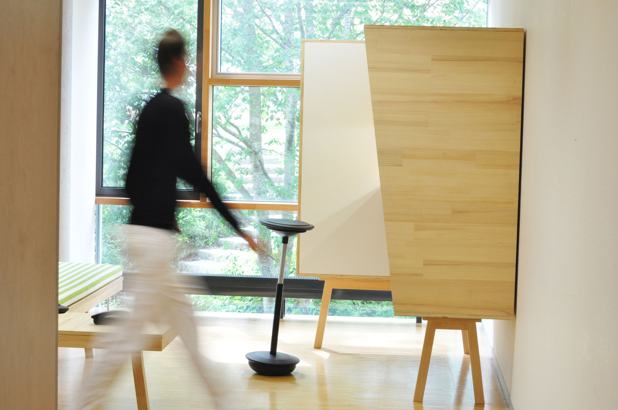 Die Bank wird aus Gleichteilen des Unterbaus der Individualräume gebildet. Durch die L-förmige Ausrichtung bildet sich je nach Situation eine Besprechungs- und Ruhezone. Die Liege lädt zum Energie tanken ein, durch Hinzuziehen der Schreibtischstitze entsteht ein Platz für Besprechungen und den Austausch. Der Stitz fördert den natürlichen Bewegungsdrang und animiert zum Aufstehen und Haltungswechsel.